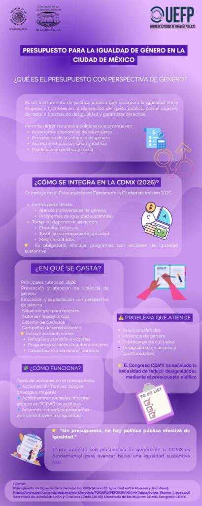 La siguiente infografía presenta de manera sencilla qué es el presupuesto con perspectiva de género, cómo se integra en el Presupuesto de Egresos de la Ciudad de México y cuáles son los principales rubros de gasto destinados a avanzar hacia una sociedad más igualitaria.